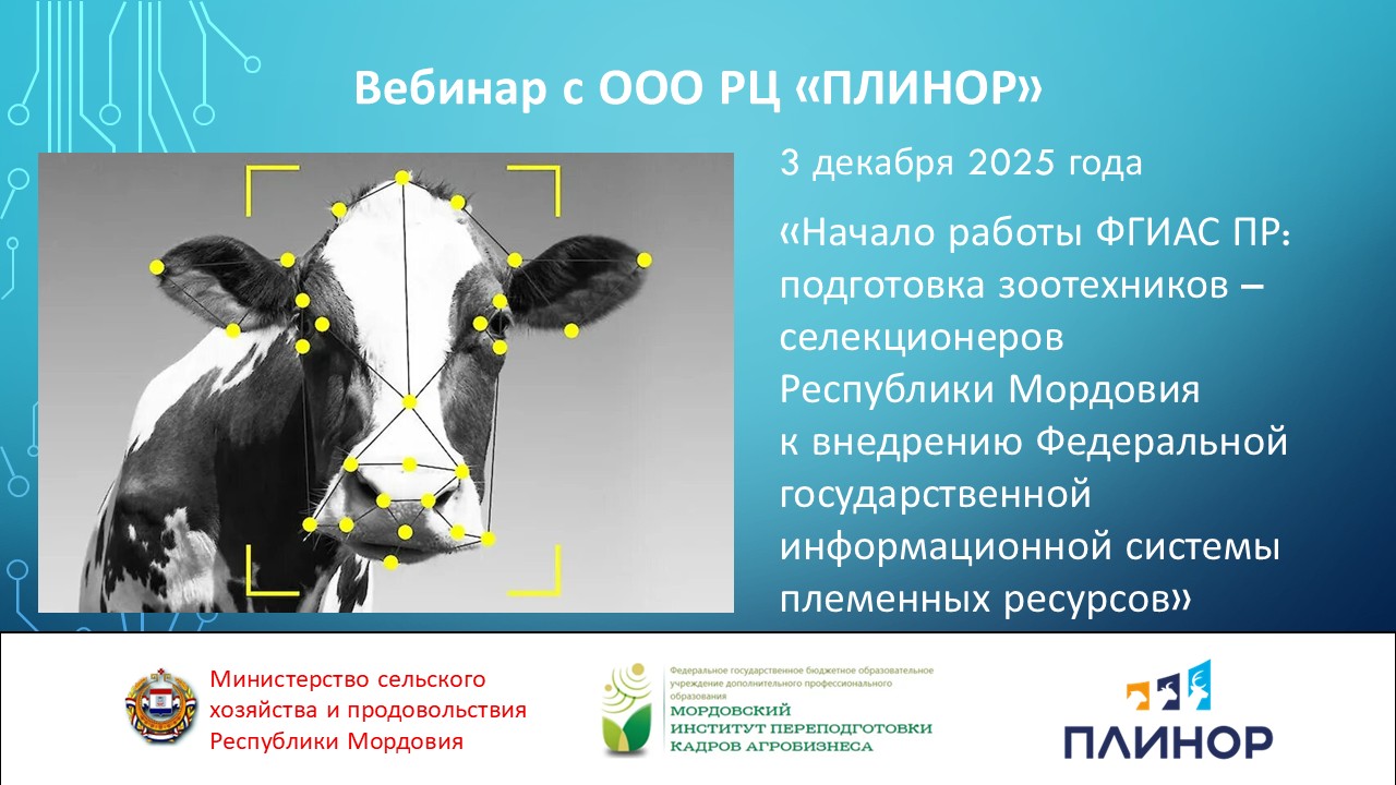 3 декабря 2025 года ФГБОУ ДПО «Мордовский институт переподготовки кадров агробизнеса» совместно с Министерством сельского хозяйства и продовольствия Республики Мордовия и ООО РЦ «Плинор» провели специализированный вебинар для зоотехников-селекционеров.